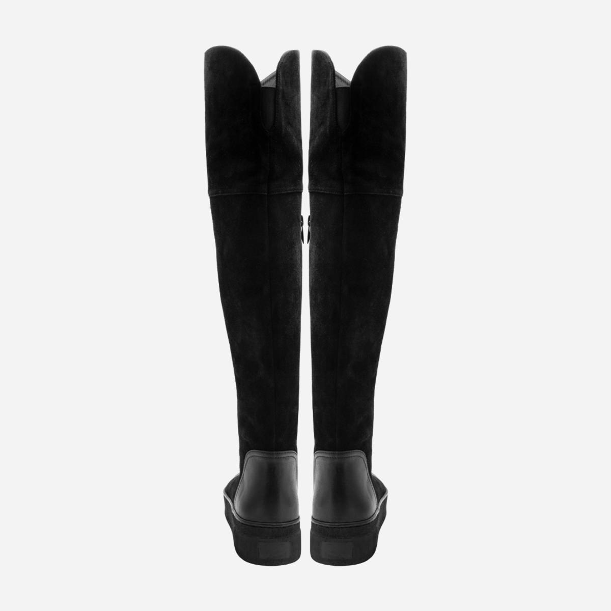 Высокие сапоги, высота голенища выше коленей — по переднему краю 50 см, по заднему краю — 45 см. Под коленом — вырез и эластичная вставка для комфорта при згибании колена. С внутренней стороны — молния до колена. Ботфорты выполнены из мягкого велюра и кожаных вставок в носочной и пяточной частях. Высота подошвы 3,5 см. Очень удобные и теплые ботфорты для холодной зимы: высокие голенища, которые закрывает колени и высокая подошва уберегут вас от морозов и ветров. Размерная сетка по длине стельки: 36 р -23,2 см, 37 р — 23,5 см, 38 р — 24,5 см, 39 р — 25 см, 40 р -25,7 см.