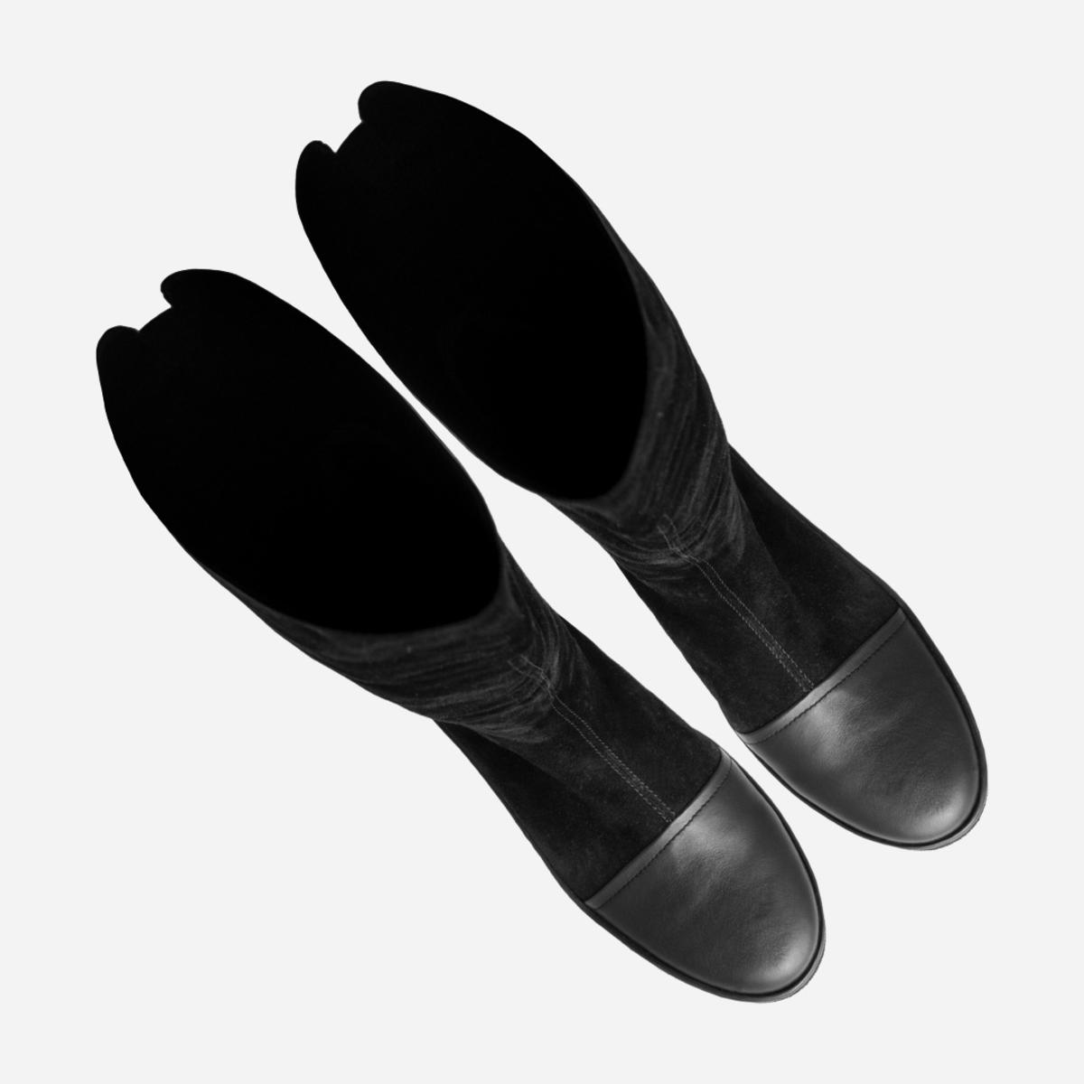 Высокие сапоги, высота голенища выше коленей — по переднему краю 50 см, по заднему краю — 45 см. Под коленом — вырез и эластичная вставка для комфорта при згибании колена. С внутренней стороны — молния до колена. Ботфорты выполнены из мягкого велюра и кожаных вставок в носочной и пяточной частях. Высота подошвы 3,5 см. Очень удобные и теплые ботфорты для холодной зимы: высокие голенища, которые закрывает колени и высокая подошва уберегут вас от морозов и ветров. Размерная сетка по длине стельки: 36 р -23,2 см, 37 р — 23,5 см, 38 р — 24,5 см, 39 р — 25 см, 40 р -25,7 см.