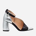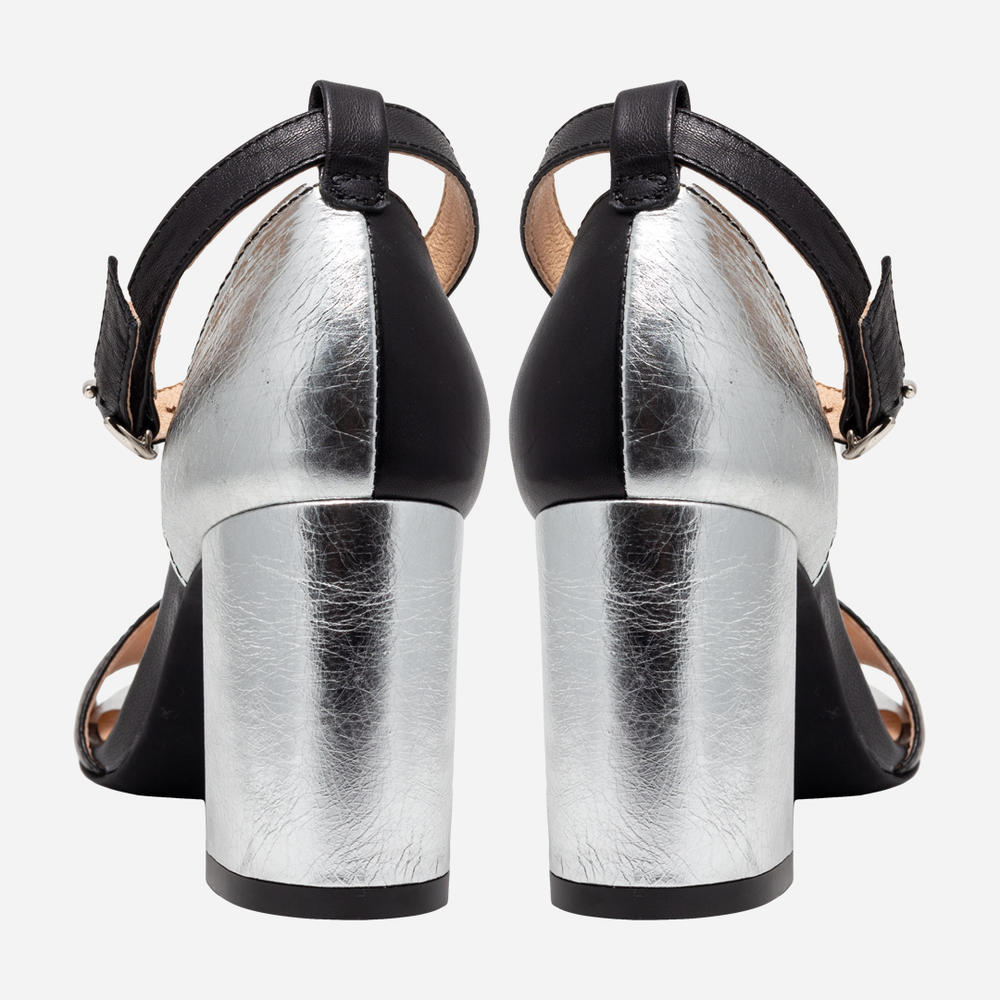 Оригинальные босоножки изготовлены из комбинации кожи черного и серебряного цвета. Удобный широкий устойчивый каблук высотой 7 см, обтянут кожей серебряного цвета. Комфортная колодка позволяет чувствовать себя уверенно на протяжении всего дня. Босоножки фиксируются вокруг щиколодки с помощью ремешка с пряжкой. Пятка закрыта. Носочная часть открыта и имеет слегка квадратную форму. Размерная сетка по стельке: 35 р -22,6 см, 36 р — 23,3 см, 37 р -24 см, 38 р — 24,6 см, 39 р — 25,3 см, 40 р — 26 см.