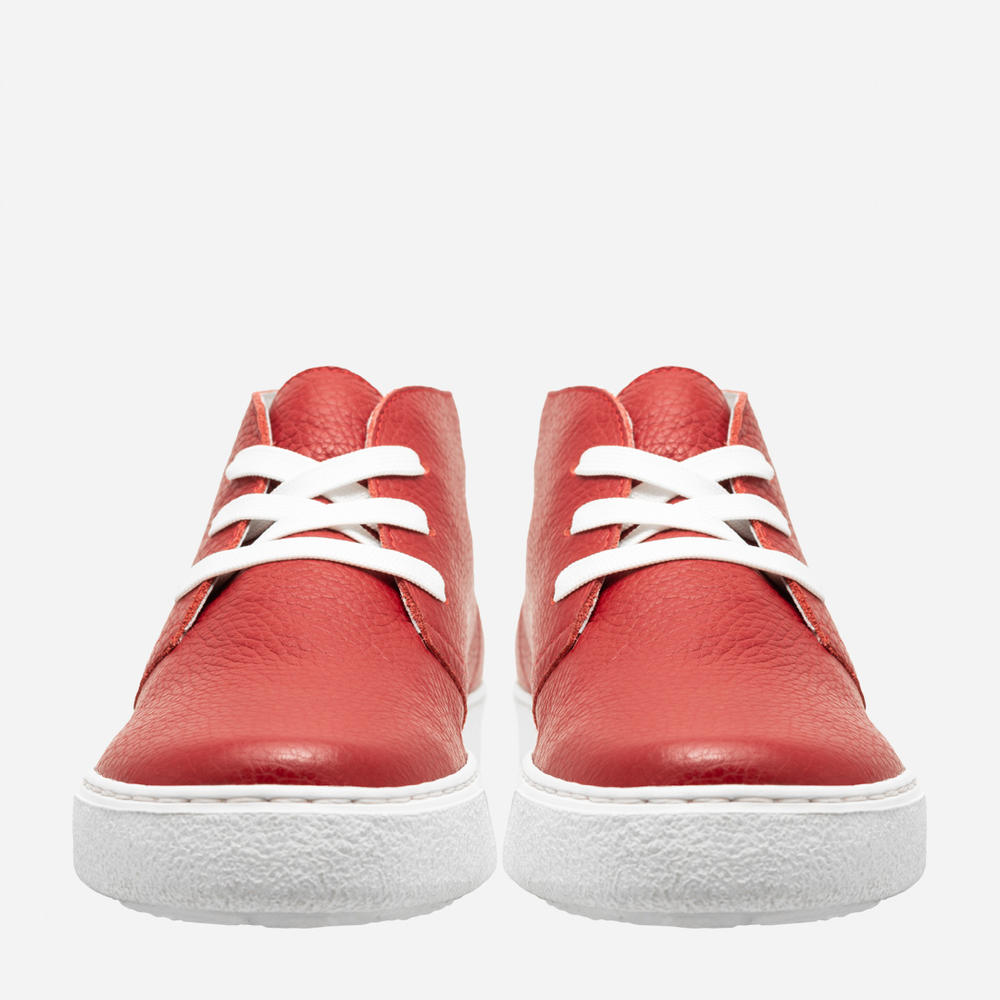 Низкие ботинки, до середины косточки, из мягкой кожи — флотар, красного цвета, без подкладки, не утепленные, на белой спортивной бодошве высотой 2,5 см. Носочная часть имеет закругленную форму. Мягкая вкладная кожаная стелька на силиконовой основе. Размерная сетка 35 р — 22,3 см, 36 р — 23 см, 37 р — 23,5 см, 38 р — 24 см, 39 р — 25 см, 40 р — 25,5 см, 41 р -26,5 см.