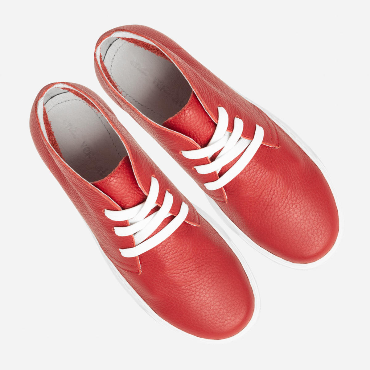 Низкие ботинки, до середины косточки, из мягкой кожи — флотар, красного цвета, без подкладки, не утепленные, на белой спортивной бодошве высотой 2,5 см. Носочная часть имеет закругленную форму. Мягкая вкладная кожаная стелька на силиконовой основе. Размерная сетка 35 р — 22,3 см, 36 р — 23 см, 37 р — 23,5 см, 38 р — 24 см, 39 р — 25 см, 40 р — 25,5 см, 41 р -26,5 см.