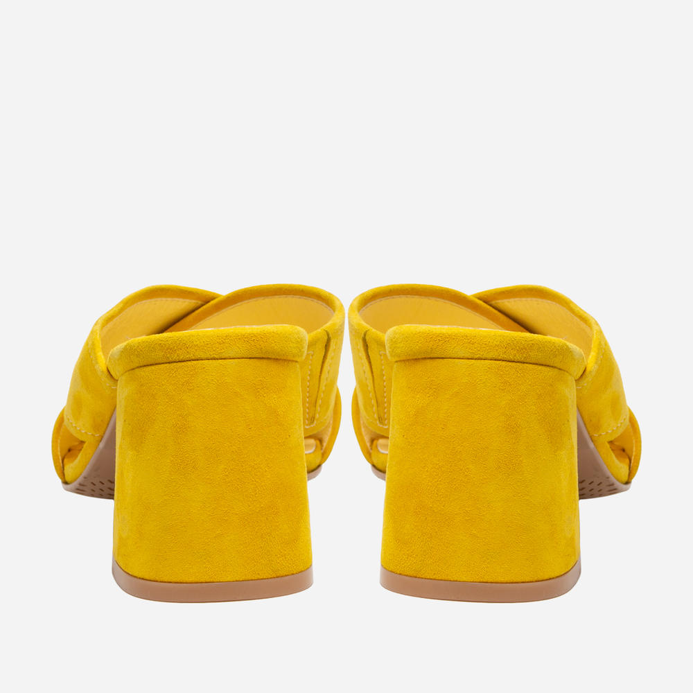Шлепанцы из мягкого велюра желтого цвета. Каблук высотой 6 см обтянут желтым велюром. Слегка приквадраченный открытый носок. Удобная колодка. Вкладная стелька с силиконом, что делает шлепанцы мягкими и удобными. Конструкция верха хорошо фиксирует стопу. Размерная сетка по длине стельки: 36 р — 23,5 см, 37 р — 24 см, 38 р — 24,5 см, 39 р — 25 см, 40 р — 25,5 см.