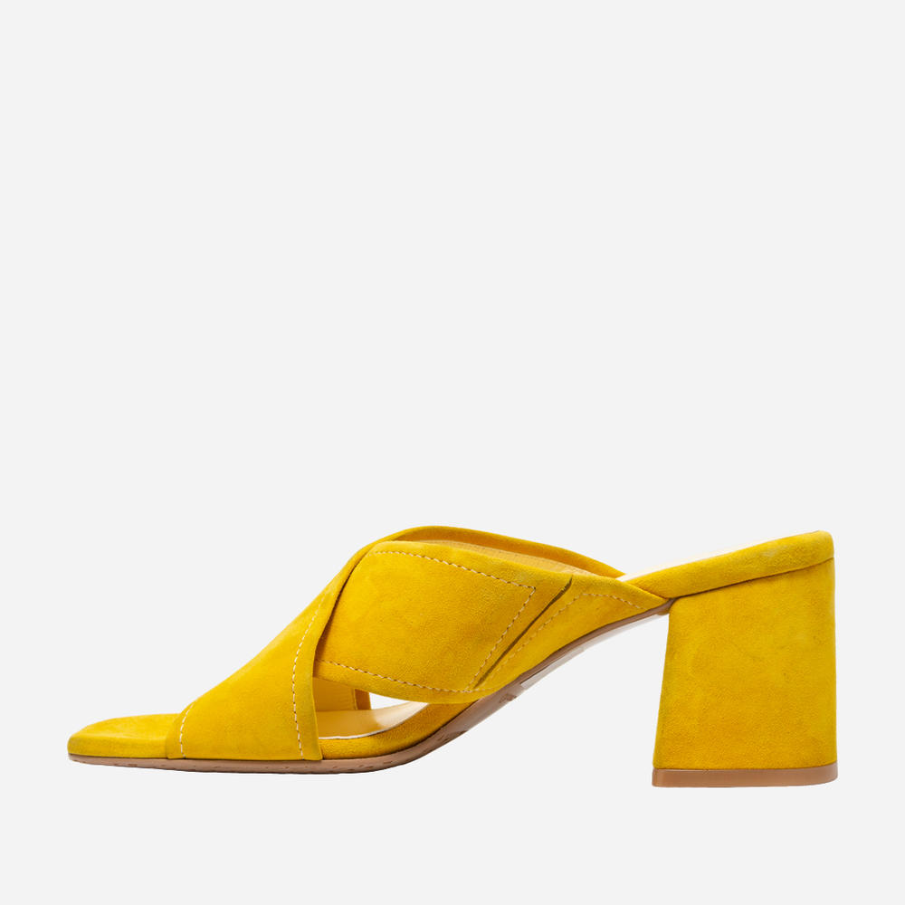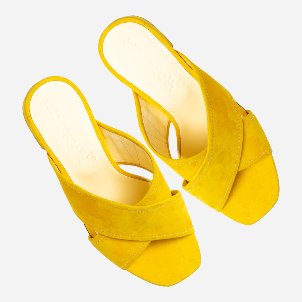 Шлепанцы из мягкого велюра желтого цвета. Каблук высотой 6 см обтянут желтым велюром. Слегка приквадраченный открытый носок. Удобная колодка. Вкладная стелька с силиконом, что делает шлепанцы мягкими и удобными. Конструкция верха хорошо фиксирует стопу. Размерная сетка по длине стельки: 36 р — 23,5 см, 37 р — 24 см, 38 р — 24,5 см, 39 р — 25 см, 40 р — 25,5 см.