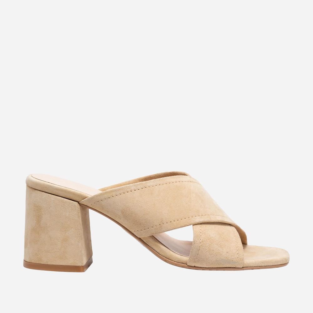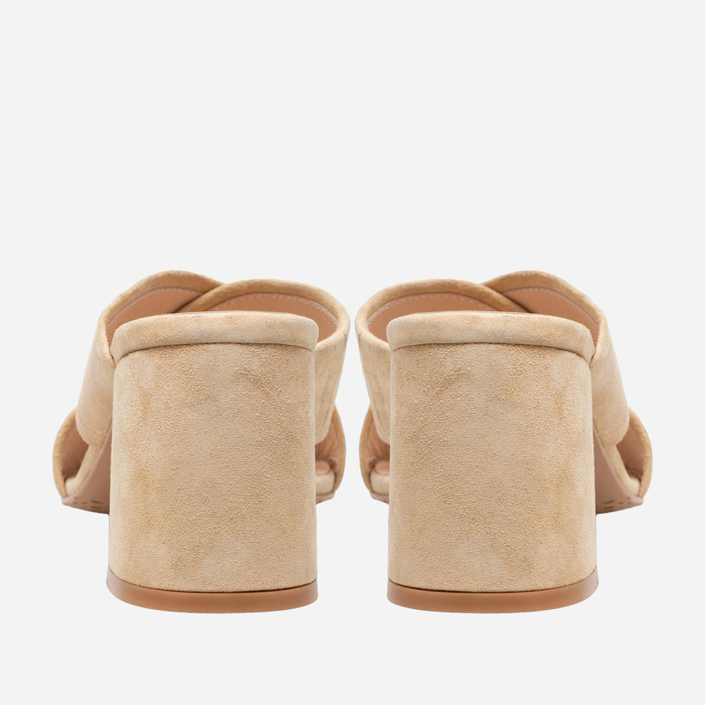 Шлепанцы из мягкого велюра бежевого цвета. Каблук высотой 6 см обтянут бежевым велюром. Слегка приквадраченный открытый носок. Удобная колодка. Вкладная стелька с силиконом, что делает шлепанцы мягкими и удобными. Конструкция верха хорошо фиксирует стопу. Размерная сетка по длине стельки: 36 р — 23,5 см, 37 р — 24 см, 38 р — 24,5 см, 39 р — 25 см, 40 р — 25,5 см.