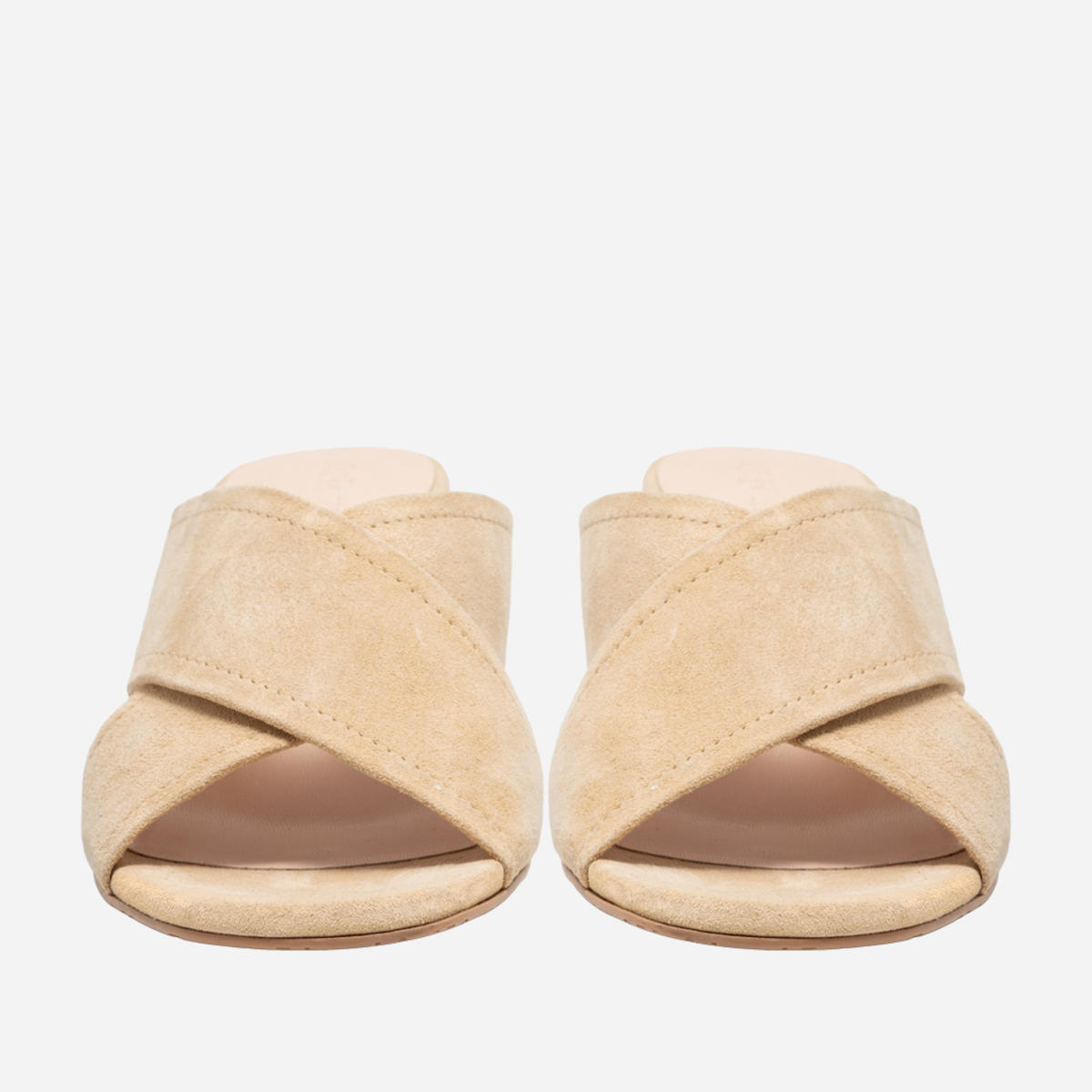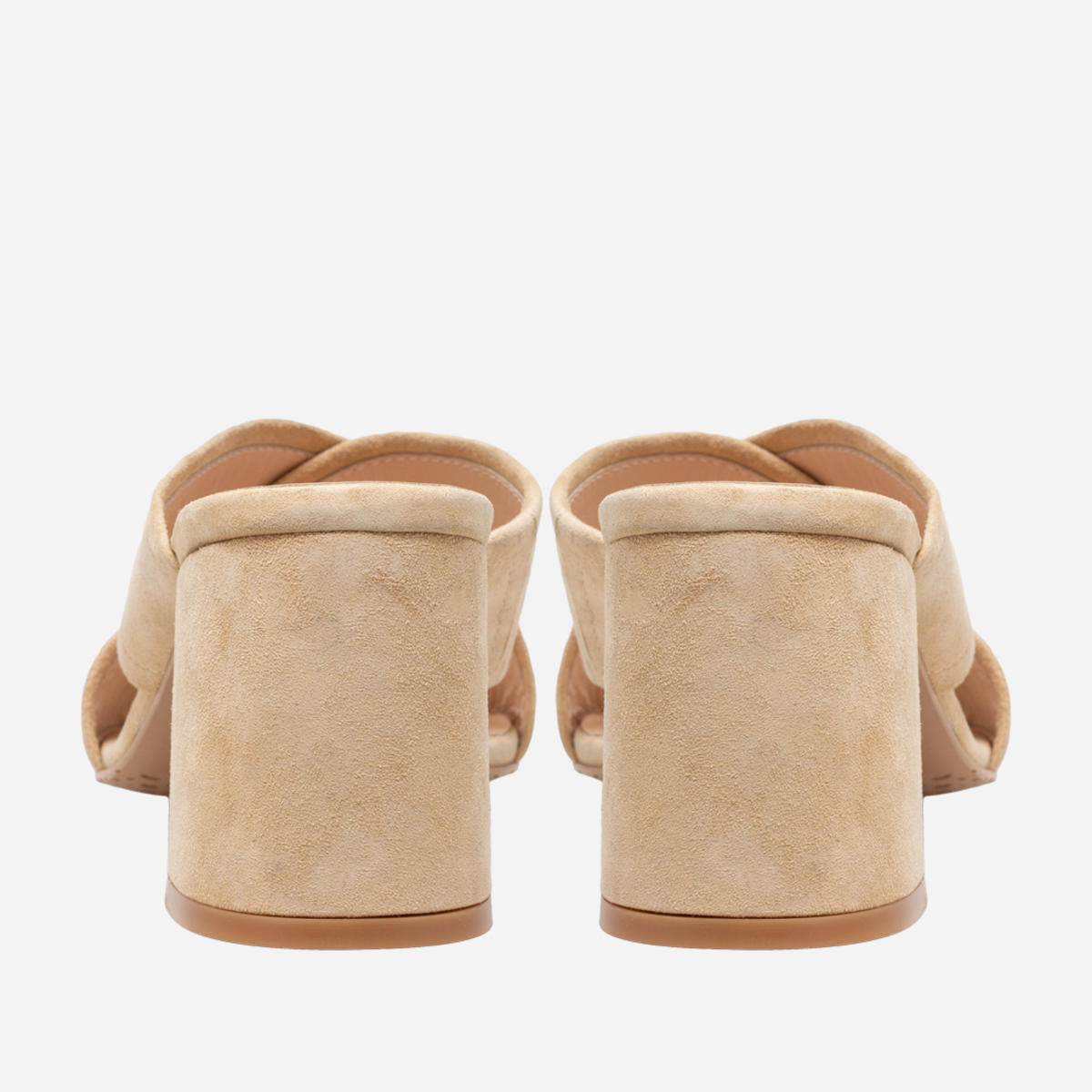 Шлепанцы из мягкого велюра бежевого цвета. Каблук высотой 6 см обтянут бежевым велюром. Слегка приквадраченный открытый носок. Удобная колодка. Вкладная стелька с силиконом, что делает шлепанцы мягкими и удобными. Конструкция верха хорошо фиксирует стопу. Размерная сетка по длине стельки: 36 р — 23,5 см, 37 р — 24 см, 38 р — 24,5 см, 39 р — 25 см, 40 р — 25,5 см.
